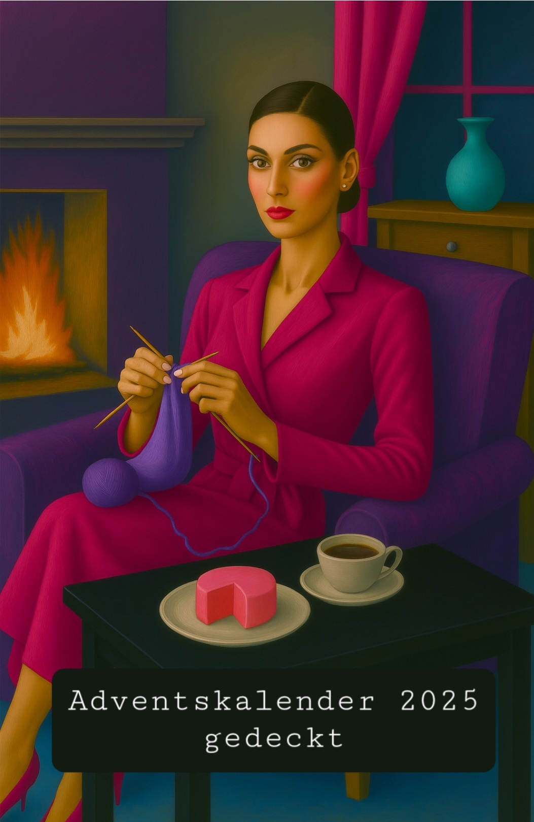 Der Adventskalender für 2025 ist da. Ein Türchenkalender in dem sich 20 auf einander abgestimmte Minis à 20g in einer tollen Merino/Kaschmir Mischung verstecken. In den 4 übrigen Fächern finden sich kleine Überraschungen rund ums Stricken. Und eine Anleitung gibts gleich noch dazu, damit man gleich starten kann.Dieses Jahr kommt der Kalender in einem Gemäldedesign daher, das neben der tollen Wolle auch noch einen Kunsttouch in Dein zu Hause bringt. KI hat mir da ein wenig geholfen. Aber ganz ehrlich? So ein strickgendes High-Fashion-Model könnte ich so nicht malen. Wer also einen stylischen Adventskalender haben möchte mit tollem Inhalt, ist hier genau richtig