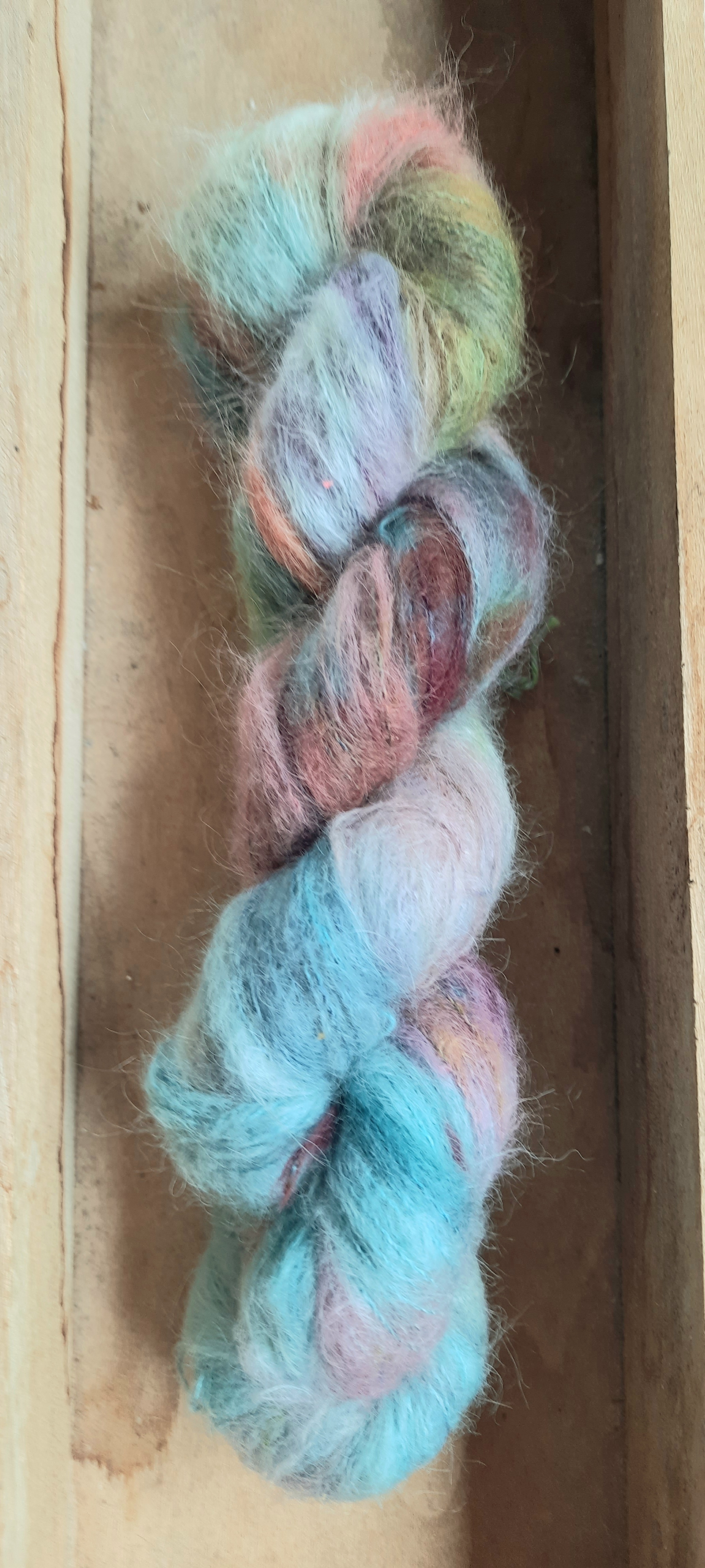 Wer Mohair mag, wird dieses Garn lieben. Es ist genauso fluggig aber um einiges weicher. Super geeignet für diejenigen, denen Mohair zu pieksig ist, die aber den Fluff mögen.
