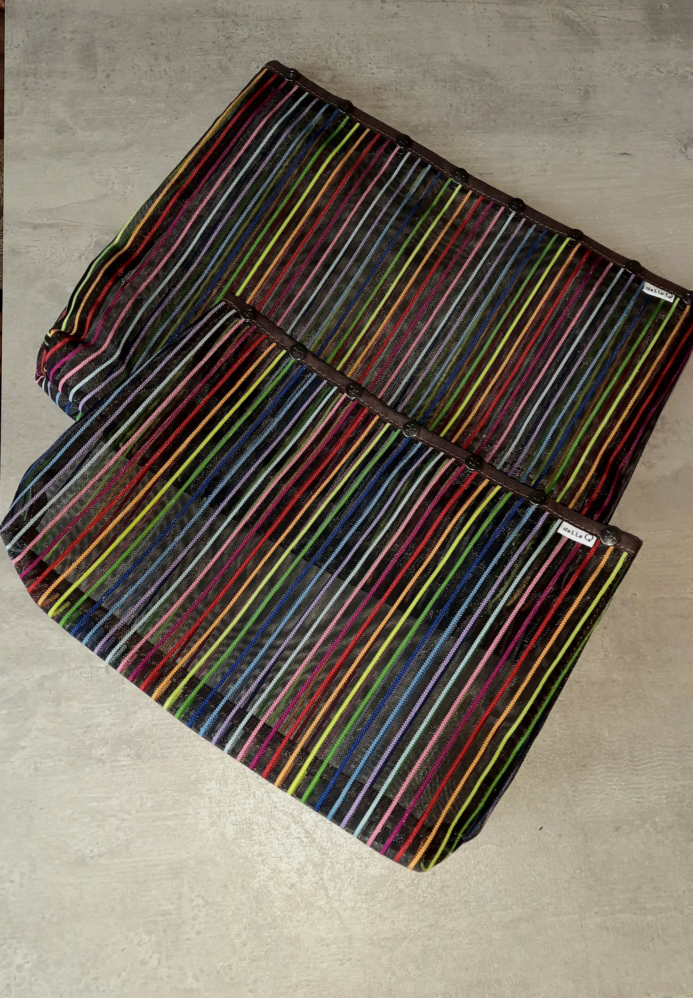 Transportiere Deine Handarbeitssachen in Style mit diesen Oh Snap Projekttaschen von Della Q. Die Oh Snaps sind aus Mesh hergestellt und daher durchsichtig – ideal, wenn Du mehrere Projekte auf den Nadeln hast, denn Du siehst auf einen Blick, was sich in der Tasche befindet. Die Taschen lassen sich sicher mit Druckknöpfen schließen. Die kleinen Öffnungen, die zwischen den Druckknöpfen entstehen, sind ideal, um den Faden nach außen zu führen. So kannst Du an Deinem Projekt arbeiten, ohne befürchten zu müssen, dass das Garn auf den Boden fällt. Selbstverständlich sind diese tollen Taschen auch für andere Zwecke zu verwenden, zum Beispiel als Kulturtasche oder für Make-up. Dieses Set besteht aus zwei Taschen in den Größen XL (35,5 x 26,5 x 5cm) und XXL (42 x 34 x 5cm).