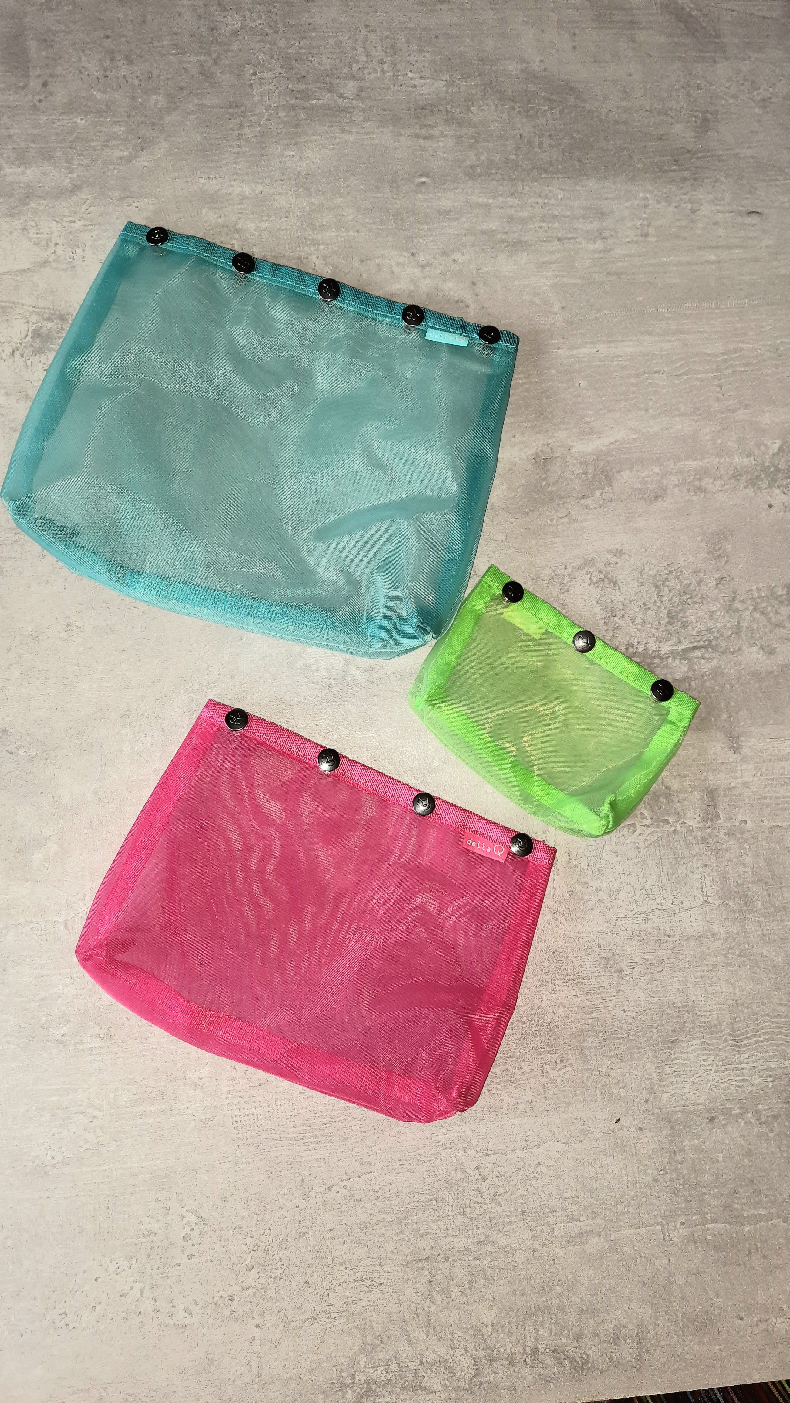Transportiere Deine Handarbeitssachen mit diesen Oh Snap Projekttaschen von Della Q. Die Oh Snaps sind aus Mesh hergestellt und daher durchsichtig – ideal, wenn Du mehrere Projekte auf den Nadeln hast, denn Du siehst auf einen Blick, was sich in der Tasche befindet. Die Taschen lassen sich sicher mit Druckknöpfen schließen. Die kleinen Öffnungen, die zwischen den Druckknöpfen entstehen, sind ideal, um den Faden nach außen zu führen. So kannst Du an Deinem Projekt arbeiten, ohne befürchten zu müssen, dass das Garn auf den Boden fällt. Selbstverständlich sind diese tollen Taschen auch für andere Zwecke zu verwenden, zum Beispiel als Kulturtasche oder für Make-up. Dieses Set besteht aus drei Taschen in den Größen S (15 x 10 x 4cm), M (23 x 16,5 x 5cm) und L (25,5 x 20 x 5cm).