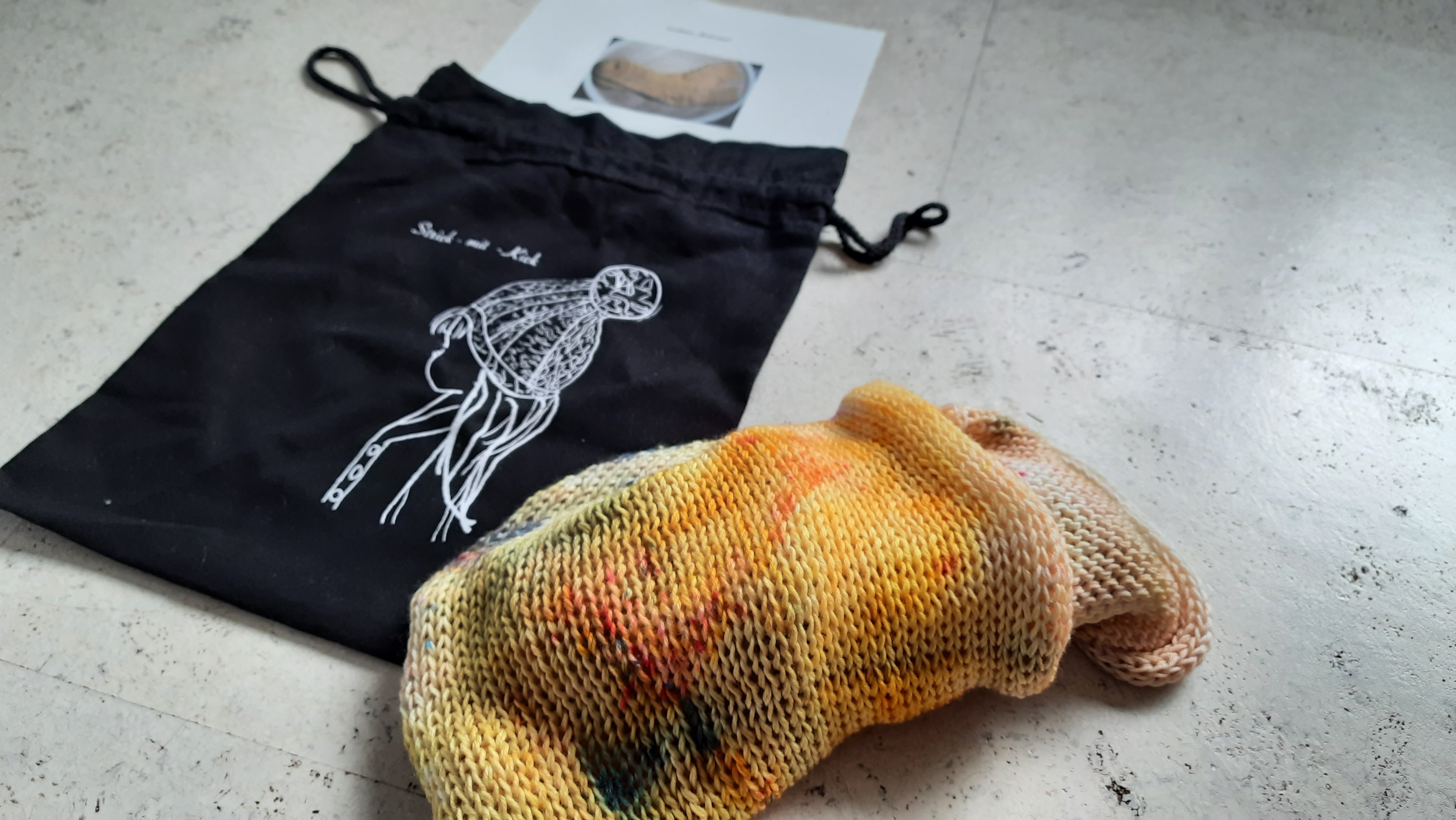 Neben der limitierten Ausführung des kleinen Projektbeutels, der sich hervorragend zum Verstauen von Sockenprojekten eignet, bekommst Du auch noch ein doppelt gestricktes one of a kind Sockblank dazu. Das bedeutet, dass Du zwei nahezu, wenn nicht sogar ganz identische Socken stricken kannst. Und falls Dir eine Sockeninspiration fehlt, gibt es noch ein Sockenmuster oben drauf.