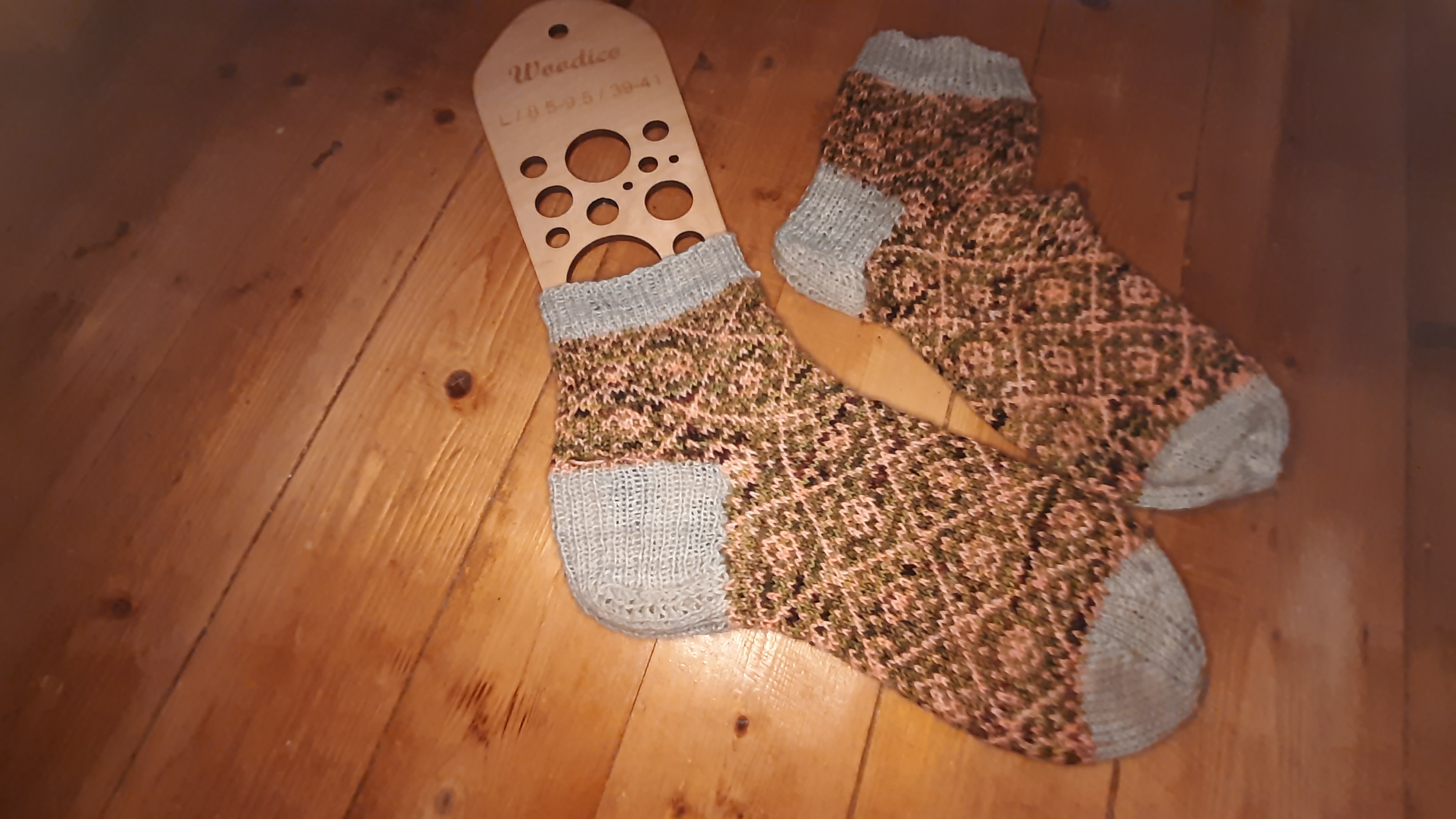 Für diese Socken benötigst Du jeweils 50 Gramm Sockenwolle Strick mit Kick Supersocks und ein Nadelspiel, mit dem du für gewöhnlich Socken strickst. Da die Weite der Socken durch die Nadelstärke variiert wird und nicht durch Musterangleichung wäre es gut auch ein paar größere Nadeln parat zu haben.