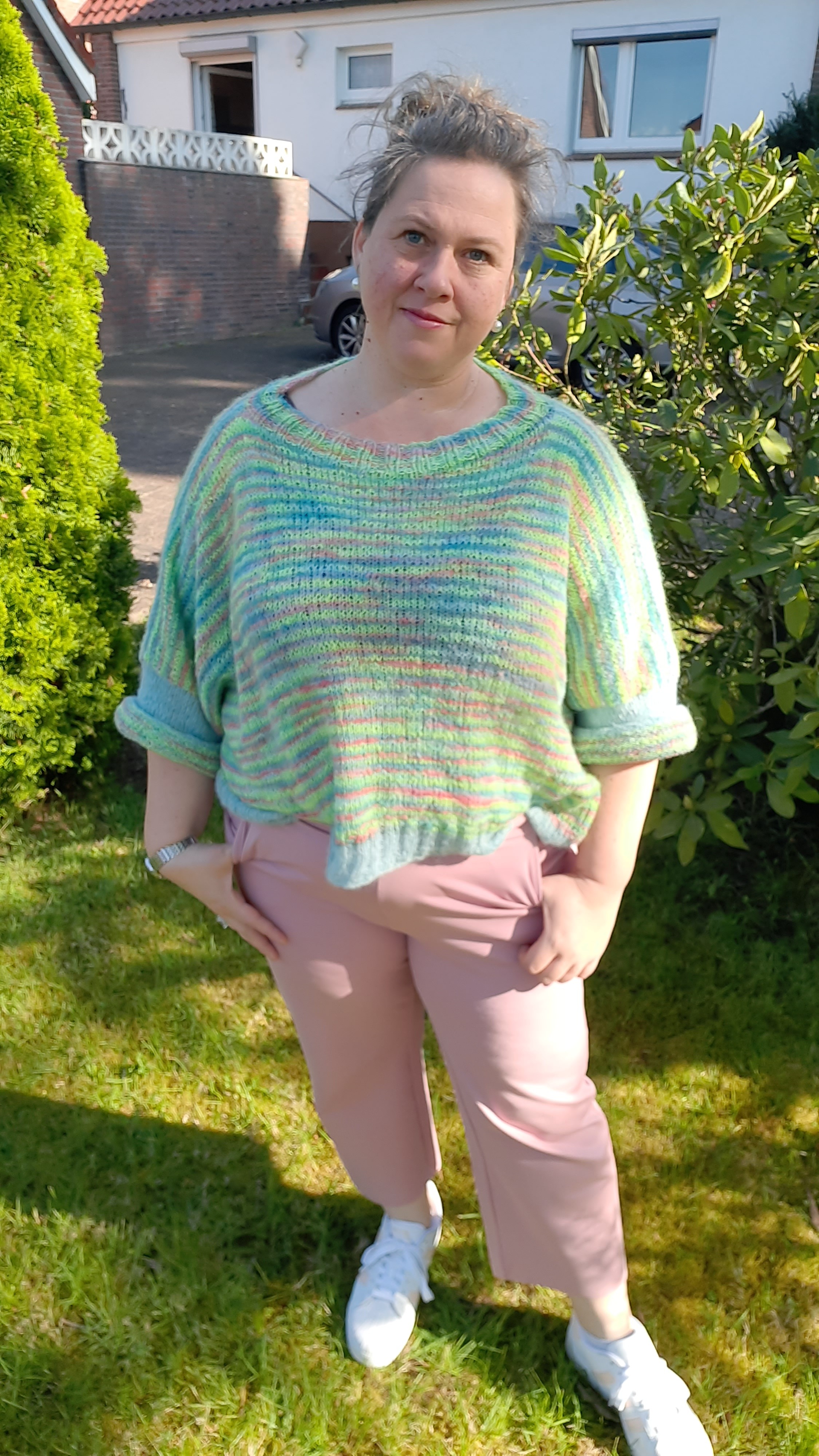 Dies ist ein luftig leichter Pulli aus dem tollen Fluffgarn. Mit nur 2 Strängen bekommst Du diesen leicht croped gestrickten Pulli gestrickt.