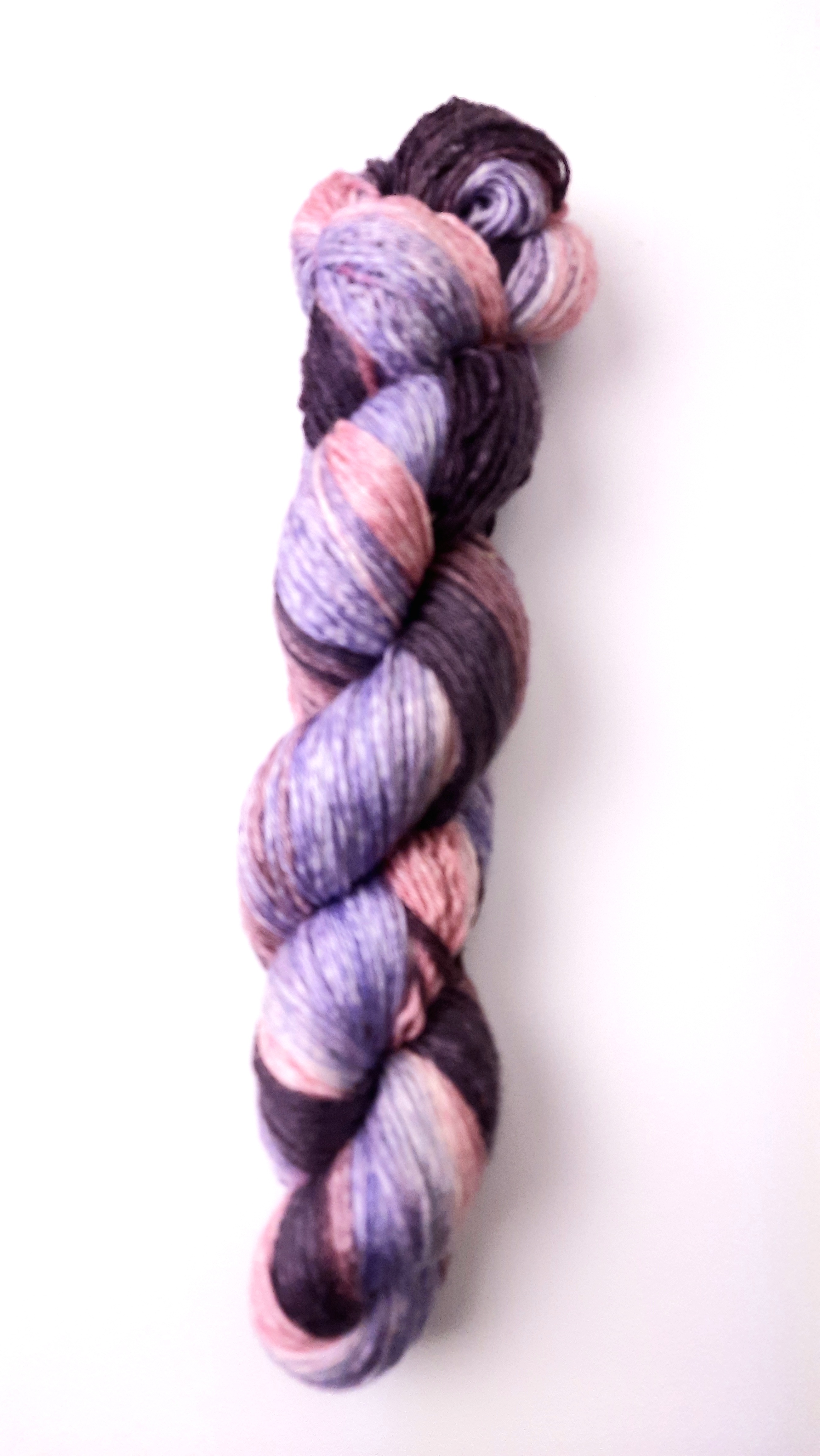 Bei diesem tollen Garn kommen die Farben gan von allein. Verschiedene Lila- und Rosenholztöne kommen von ganz allein Stück für Stück zum Vorschein. Perfekt für Tücher, bei dem die Farben in einander überlaufen oder für umfangreiche Colorworkprojekte geeignet.
